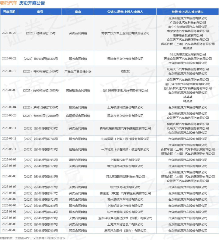 值得警惕的是,这已不是哪吒汽车首次因合同问题走上法庭。据天眼查数据显示,近一年内该公司累计有350起开庭公告,其中129起为“买卖合同纠纷”,50起为“服务合同纠纷”,合同管理问题已呈多发态势。